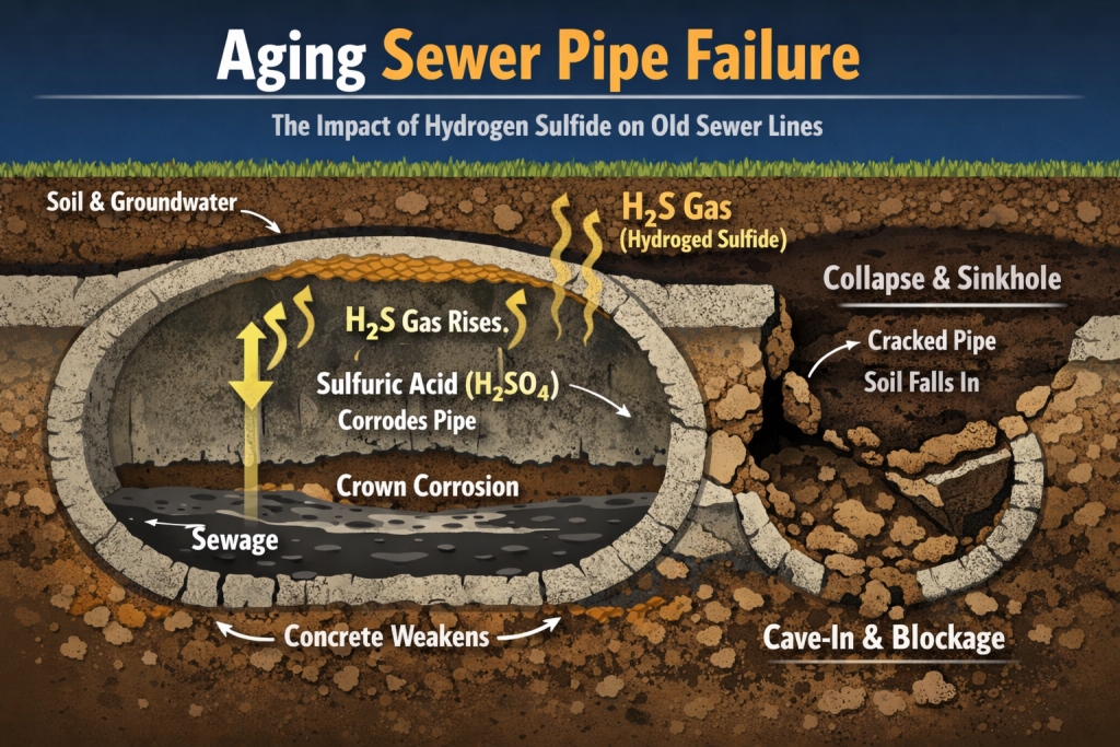Decades of hydrogen sulfide gas rise inside the pipe, convert to sulfuric acid, and slowly corrode the concrete at the crown. Over time, the pipe wall thins, soil pressure increases, cracks form — and eventually the structure gives way.