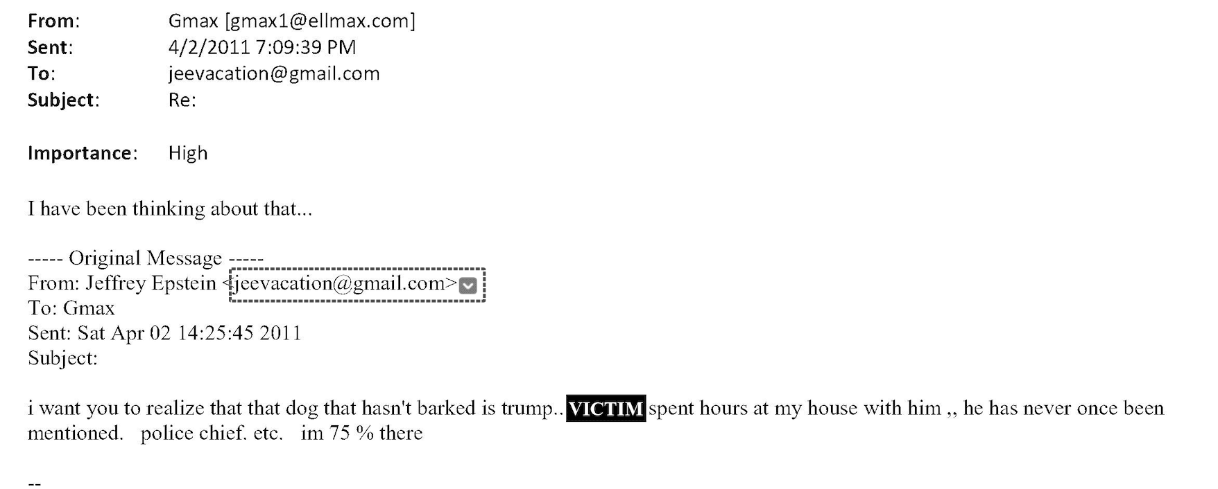 In one email from 2011 to Epstein associate Ghislaine Maxwell, Epstein wrote: “That dog that hasn’t barked is Trump … [Victim] spent hours at my house with him, he has never once been mentioned.” Another email from 2015 between Epstein and author Michael Wolff discussed how to respond to questions about Trump’s ties to Epstein, with Wolff suggesting, “If he says he hasn’t been on the plane or to the house, then that gives you a valuable PR and political currency.”