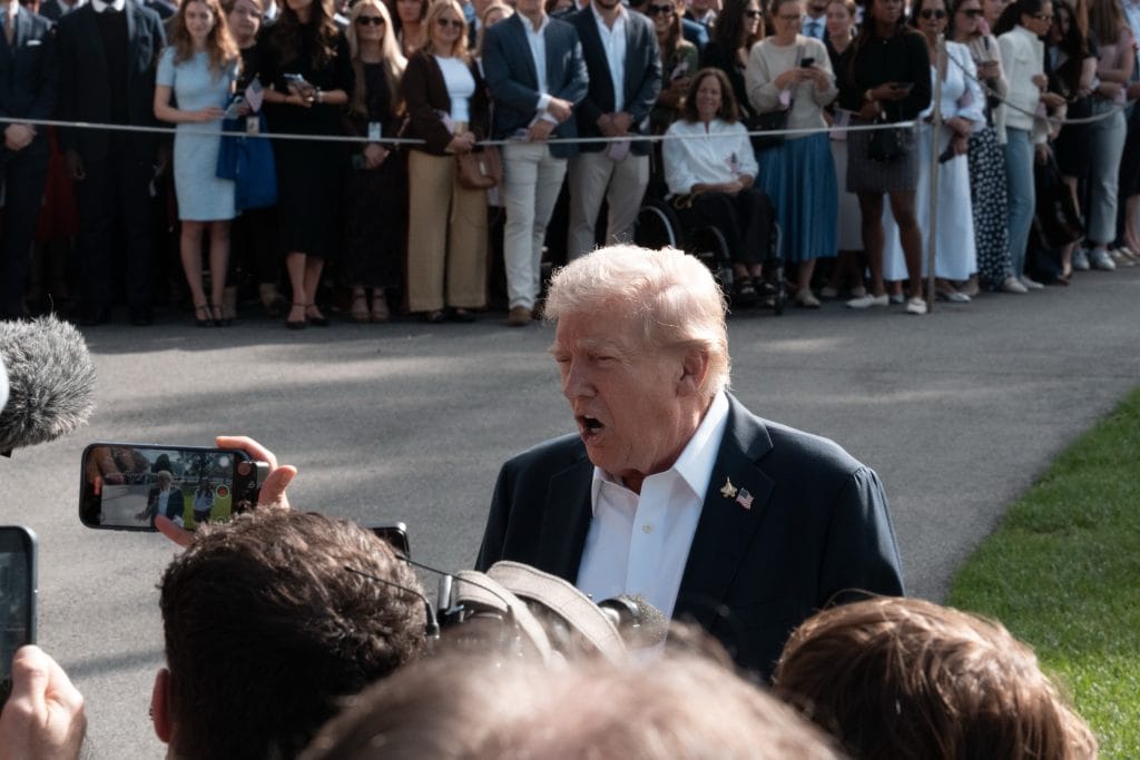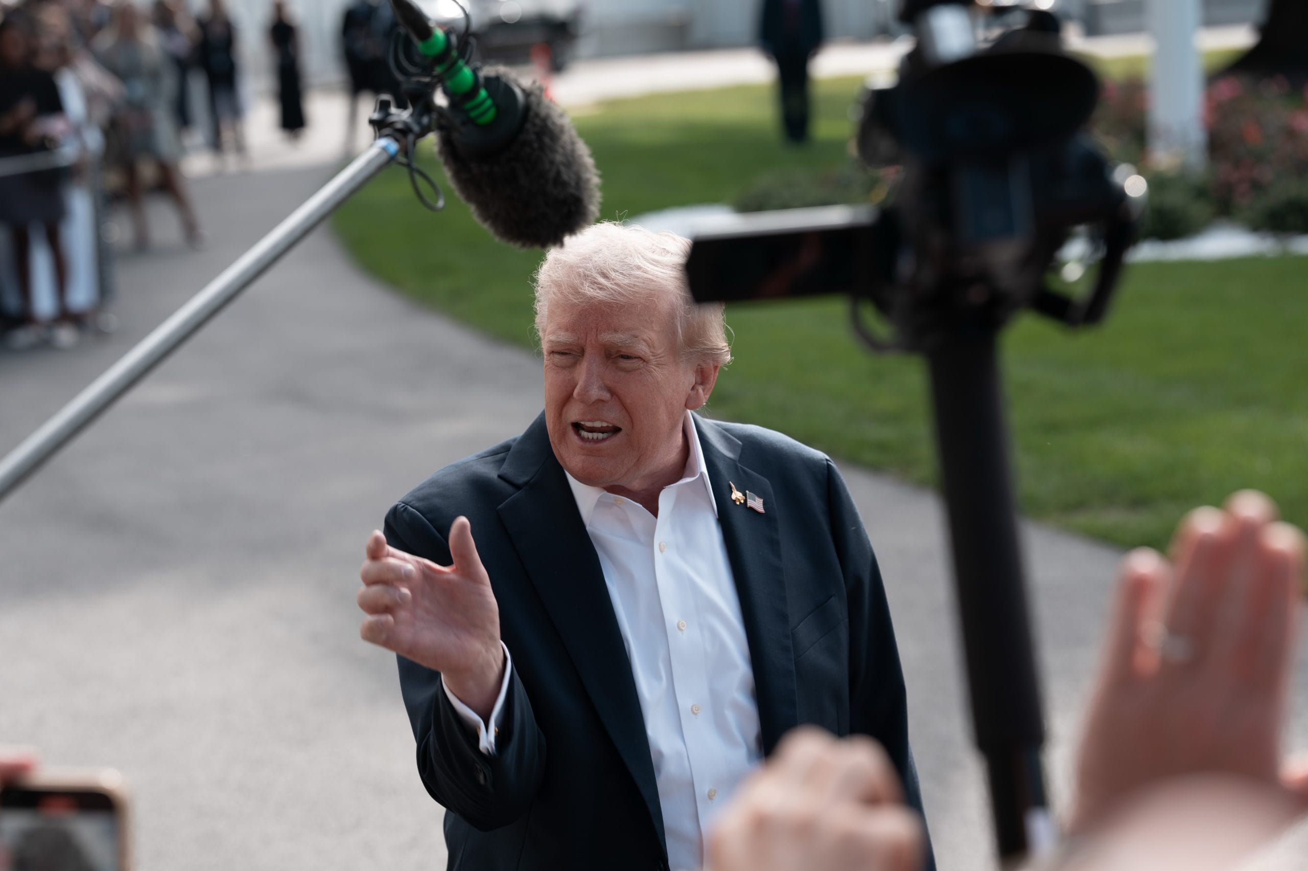 President Donald Trump departed the White House South Lawn on Thursday morning en route to Farmingdale, N.Y., where he will represent the United States at the Ryder Cup golf tournament. Before boarding Marine One, Trump briefly spoke with reporters, touching on international negotiations and domestic political tensions.
