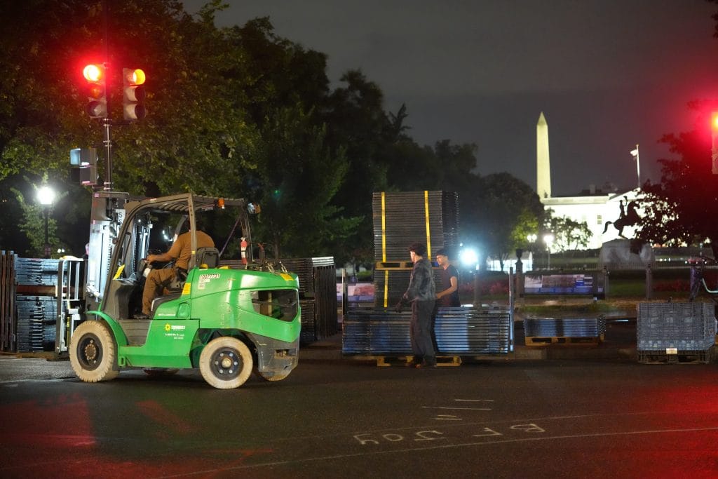 Workers put up tall anti-scale fencing around the White House and Lafayette Square late Tuesday, temporarily blocking pedestrian access to areas that typically remain open.